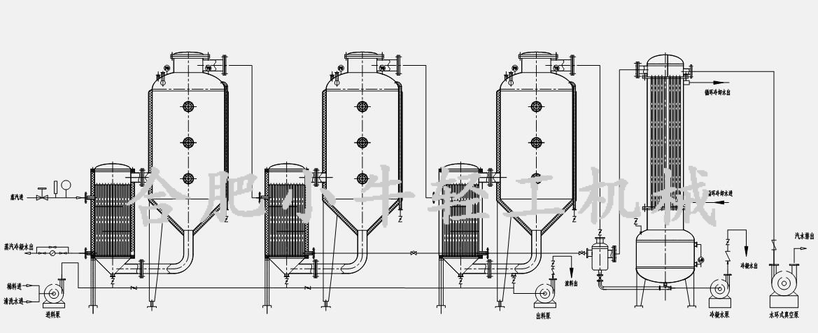 三效外循環(huán)蒸發(fā)器主要組成部件有第一效加熱器、第二效加熱器、第三效加熱器、第一效分離器、第二效分離器、第三效分離器、冷凝器、冷凝水罐、真空泵、料液泵、閥門管路系統(tǒng)、電控系統(tǒng)等。設(shè)備在運行時,料液通過泵送或真空自吸原理進入各效加熱器及各效分離器的管程,加熱介質(zhì)(鍋爐蒸汽)進入第一效加熱器的殼程,料液在真空狀態(tài)下沸點降低,當(dāng)受熱到一定溫度后開始沸騰,并從噴射管噴入分離器,進行快速蒸發(fā)和汽液分離,未被蒸發(fā)的料液從底部循環(huán)管回流到加熱器再次噴入分離器,形成循環(huán)。由一效加熱器產(chǎn)生的二次蒸汽進入二效加熱器殼程,作為第二效加熱器的加熱介質(zhì),同理第二效的二次蒸汽作為第三效加熱器的加熱介質(zhì),熱能得到充分利用,從而實現(xiàn)節(jié)能效果。最后的蒸汽進入冷凝器,被冷卻循環(huán)水換熱冷凝成液相,進入冷凝水收集罐,最后排出。第二效、第三效的物料運動狀態(tài)與第一效同理,當(dāng)料液縮到一定的程度,經(jīng)取樣確定合格后即可出料,完成蒸發(fā)濃縮過程。