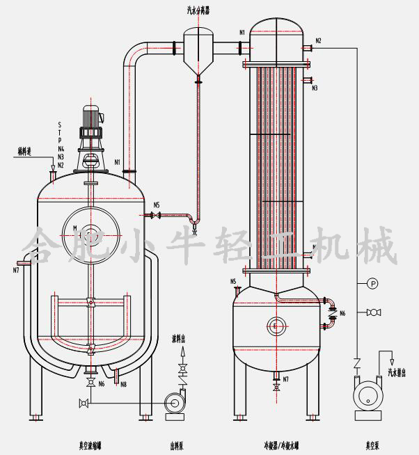 合肥小牛真空減壓濃縮器加熱形式可根據(jù)用戶工況設(shè)計為蒸汽加熱式或電加熱式,滿足無鍋爐熱源的用戶使用。真空濃縮罐設(shè)有夾套及保溫層,夾套內(nèi)通入蒸汽(蒸汽加熱式)或?qū)嵊停娂訜崾剑┻M行加熱,從而給濃縮罐內(nèi)物料間接傳熱,耐高溫保溫層能有效隔熱保溫,減少能耗,有效避免操作人員燙傷事故發(fā)生。罐體配有視鏡視燈,能夠隨時觀察罐內(nèi)狀態(tài)。生產(chǎn)完成后,利用CIP自動旋轉(zhuǎn)清洗球能夠?qū)迌?nèi)進行360度沖洗。特殊定制的攪拌裝置有效地避免了料液因濃度過高而出現(xiàn)的粘壁現(xiàn)象,攪拌裝置采用優(yōu)質(zhì)機械密封,確保不會因高真空而出現(xiàn)漏氣現(xiàn)象。真空濃縮罐內(nèi)物料受熱而產(chǎn)生的蒸汽中帶有有效成份的泡沫在汽液分離器中被分離出來通過管道回流至罐內(nèi),其余二次蒸汽通過列管式換熱器被冷凝成液體,進入冷凝水收集罐,最后排出或回收利用,不凝性氣體隨真空泵一起排出。該設(shè)備可進行負壓或常壓操作,也可以進行連續(xù)或間歇生產(chǎn)。
